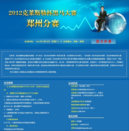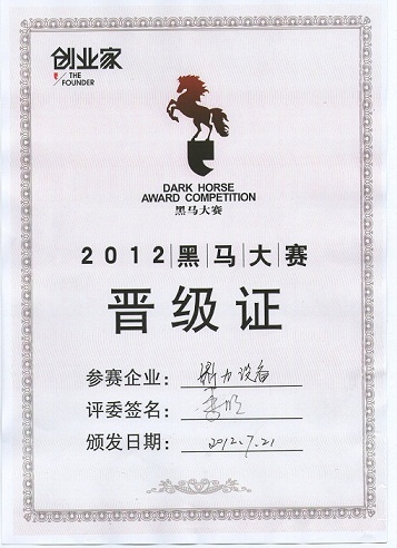 2012年7月21日,我公司應約參加了2012克萊斯勒杯黑馬大賽鄭州分賽。參賽過程中,我公司抱著支持推動河南創業創新的發展,促進省內外企業界和投資界交流互動的態度,充分發揮企業優勢、宣揚鼎力文化、展現企業實力,獲得了在場評委和嘉賓的一致好評,成功榮獲了2012克萊斯勒杯黑馬大賽鄭州分賽第一名,取得了晉級2012克萊斯勒杯黑馬大賽秋季賽的資格。