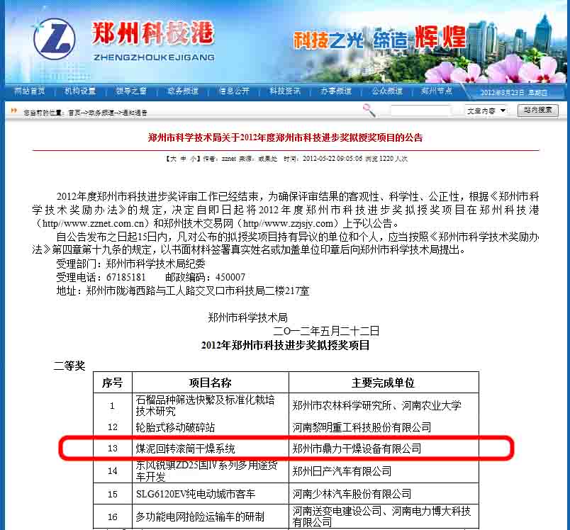 我公司煤泥回轉滾筒干燥系統獲2012年度鄭州市科技進步二等獎-鼎力干燥
